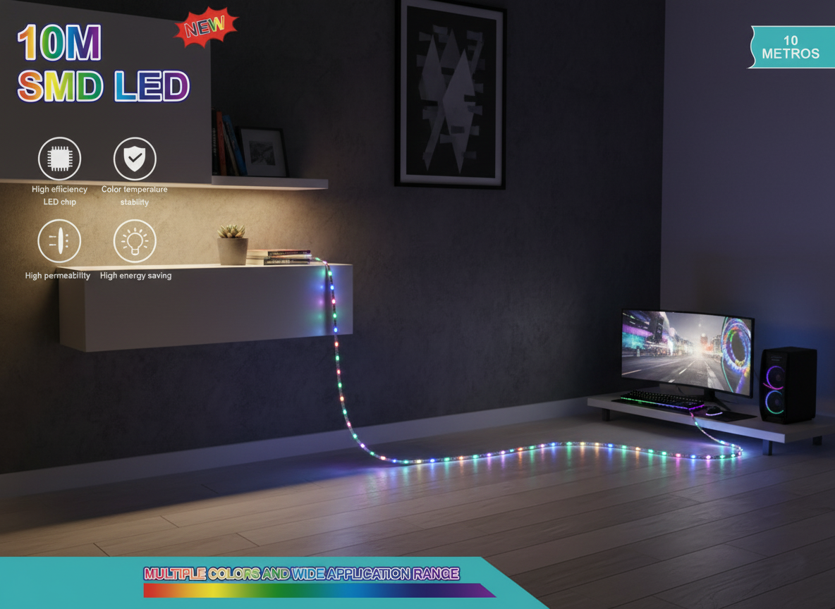 10 Meter RGB SMD LED Strip Light – Flexible, Color Changing, High Brightness, Decorative Lighting (10M)