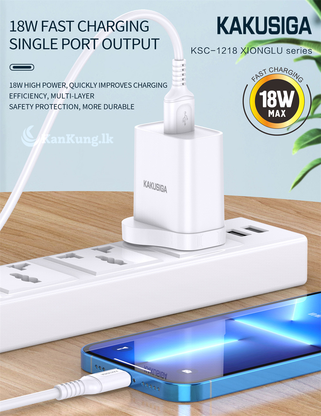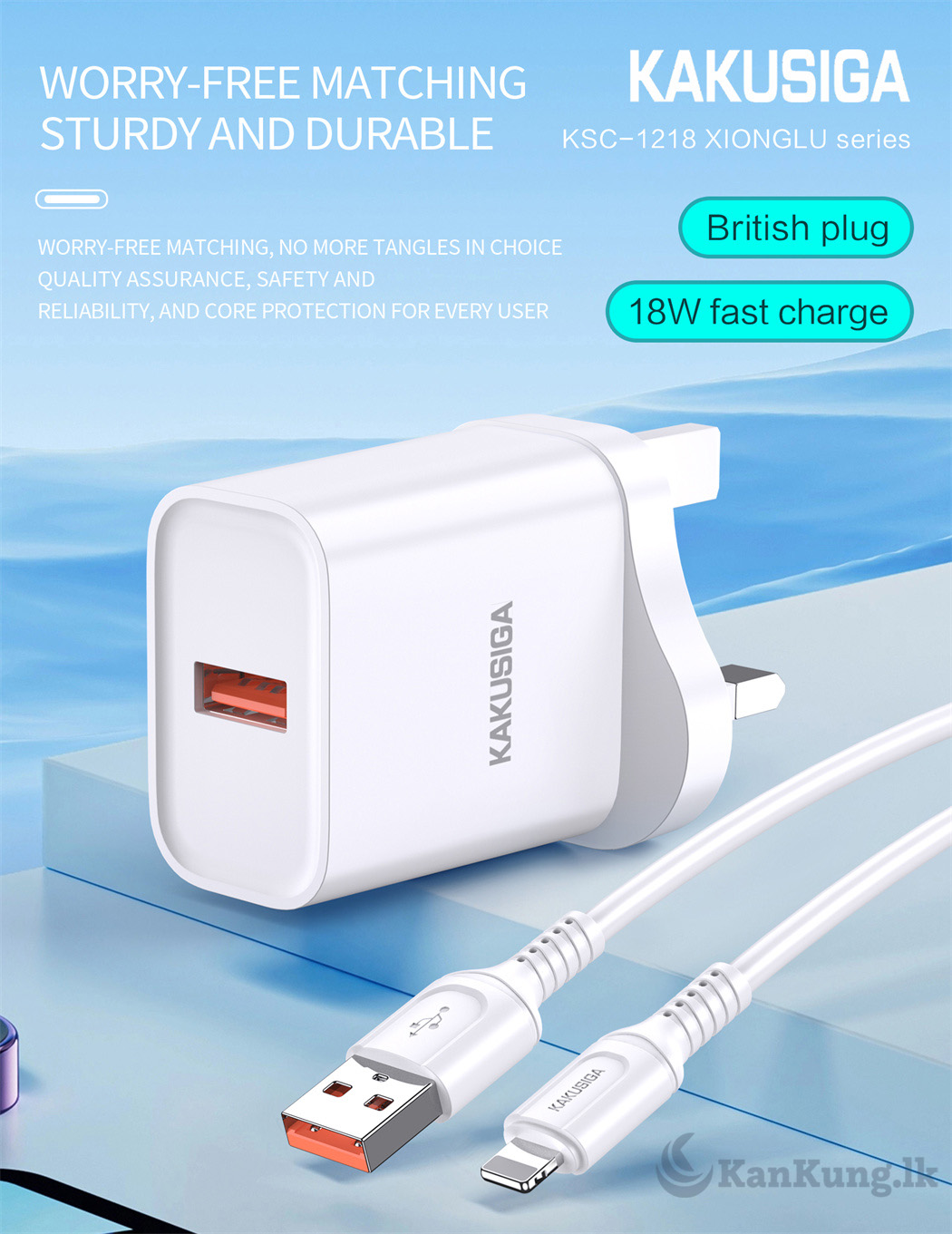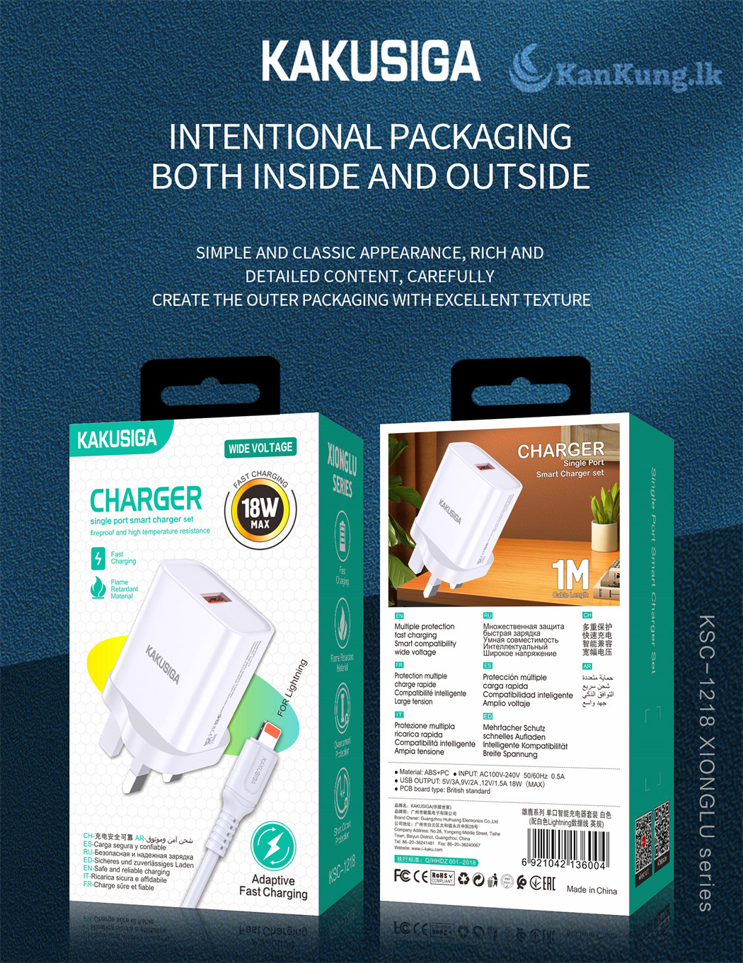 Power up your devices quickly and safely with the KAKUSIGA KSC-1218 Fast Charger. Designed for efficiency, this 18W max output charger ensures fast and adaptive charging for your compatible devices. It comes with a 1M Lightning cable, making it perfect for iPhones and other Apple devices. The charger is built with flame-retardant material and multiple safety protections, including overcurrent and short-circuit protection, for a reliable and safe charging experience.