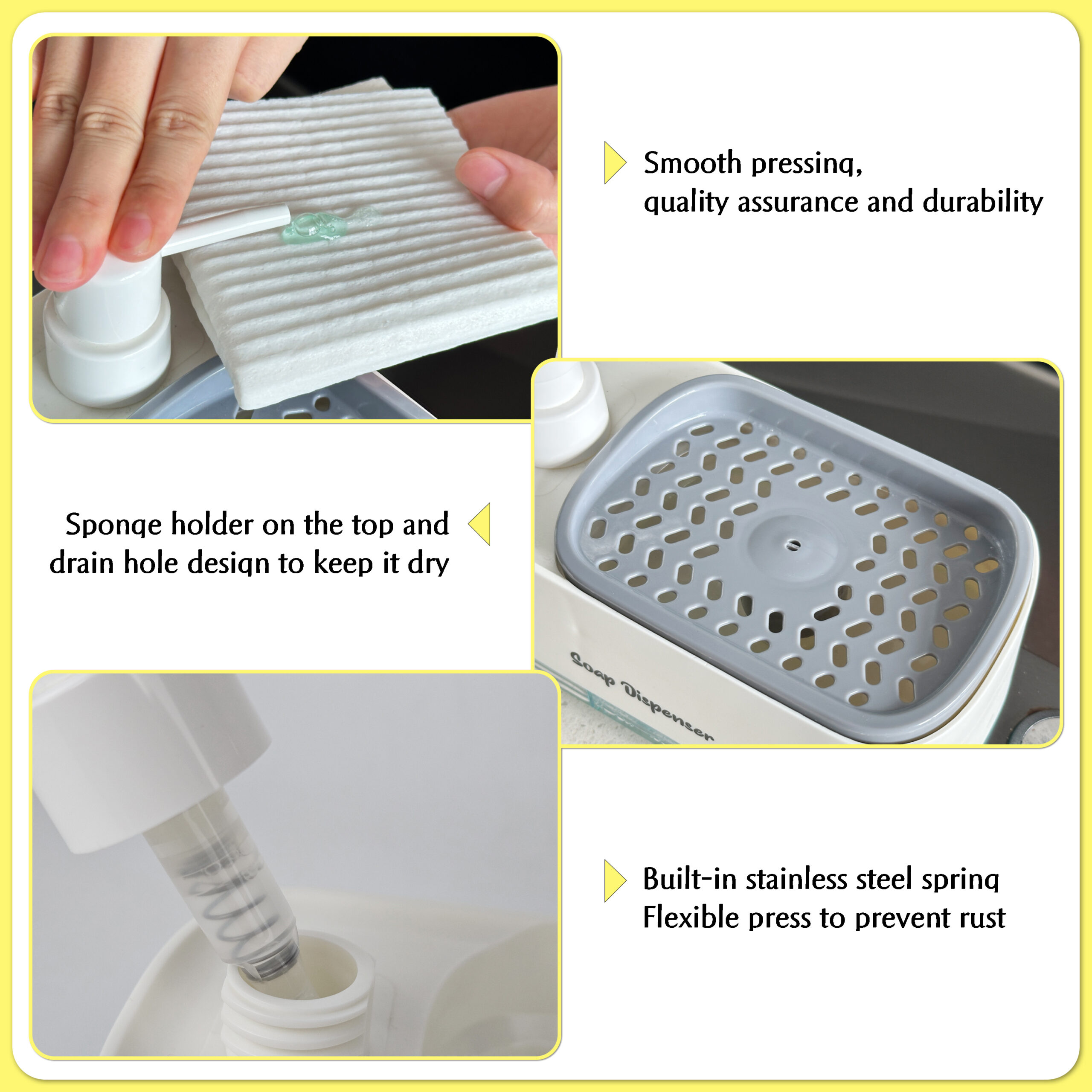 • Easy Press Operation: Simply press down on the top tray to dispense dish soap directly onto your sponge.