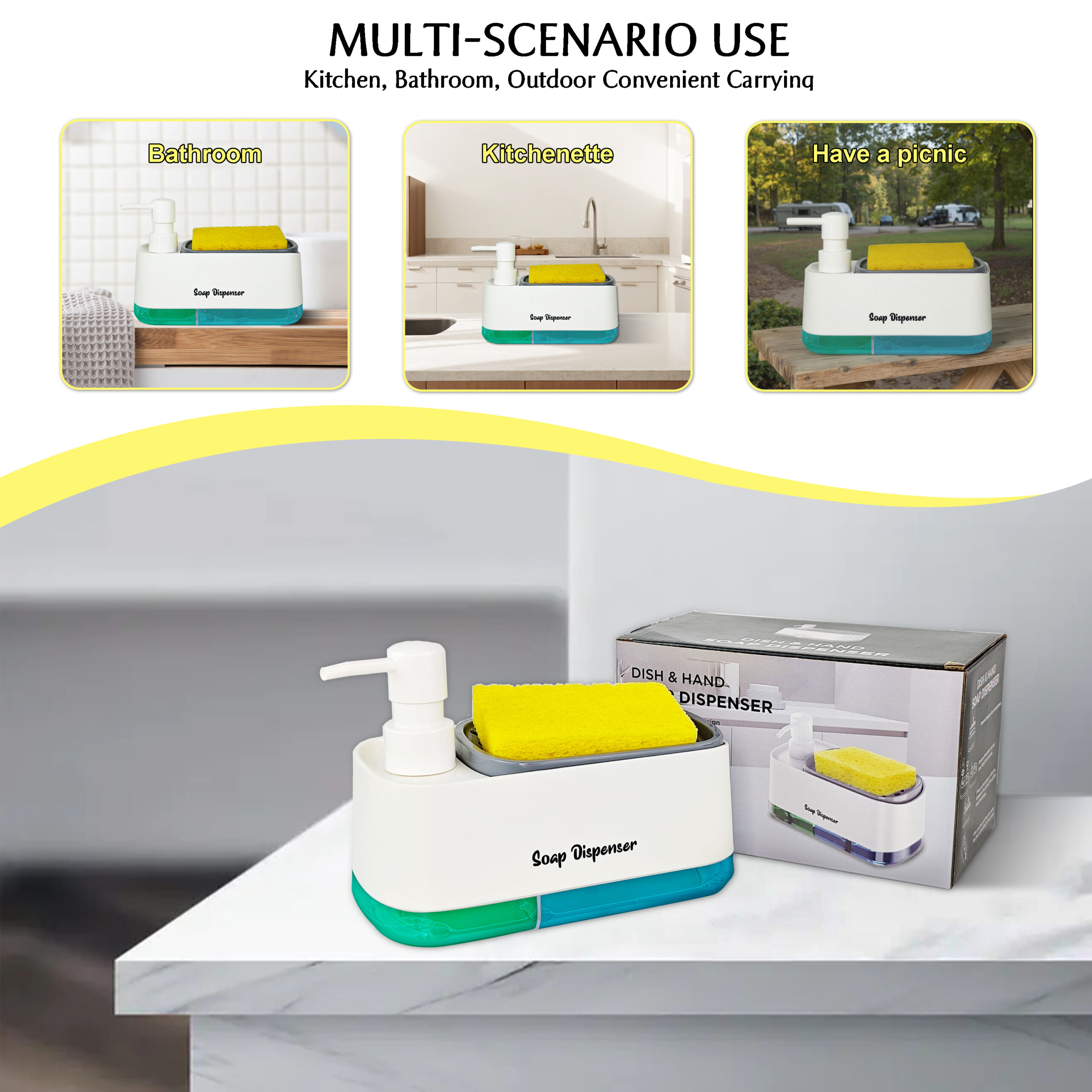 • Dual-Function Design: Features a dedicated hand soap pump and a specialized dish soap dispenser with a sponge press-top.