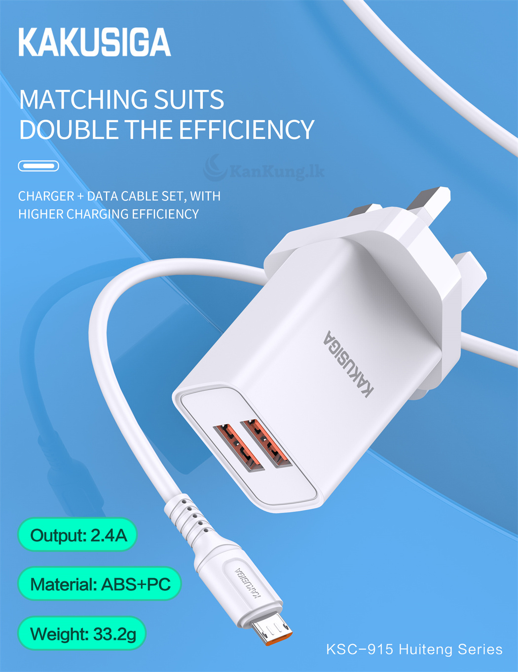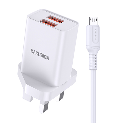 The Kakusiga Dual Port Smart Charger is a fast and reliable charging solution designed for multiple devices. With two USB ports delivering a combined output of 2.4A, you can charge two devices simultaneously with optimal efficiency. Featuring adaptive fast charging and wide voltage compatibility (100V-240V), it is perfect for home, office, and travel use. The included 1-meter micro USB cable ensures convenience for various devices.