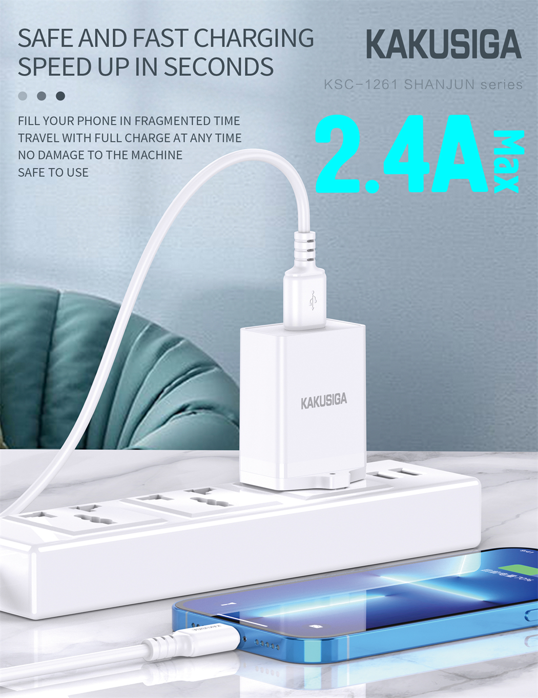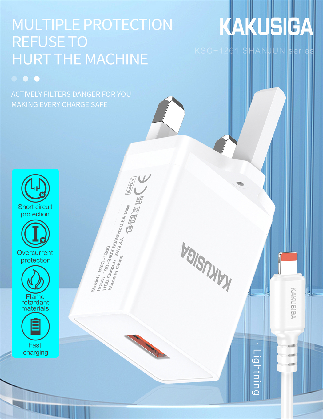 Power up your devices quickly and safely with the KAKUSIGA Shanjun Series Single Port Charger Set. Designed for everyday convenience, this charger comes with a Lightning cable and a UK standard , delivering up to 2.4A fast charging for iPhones and other compatible devices.