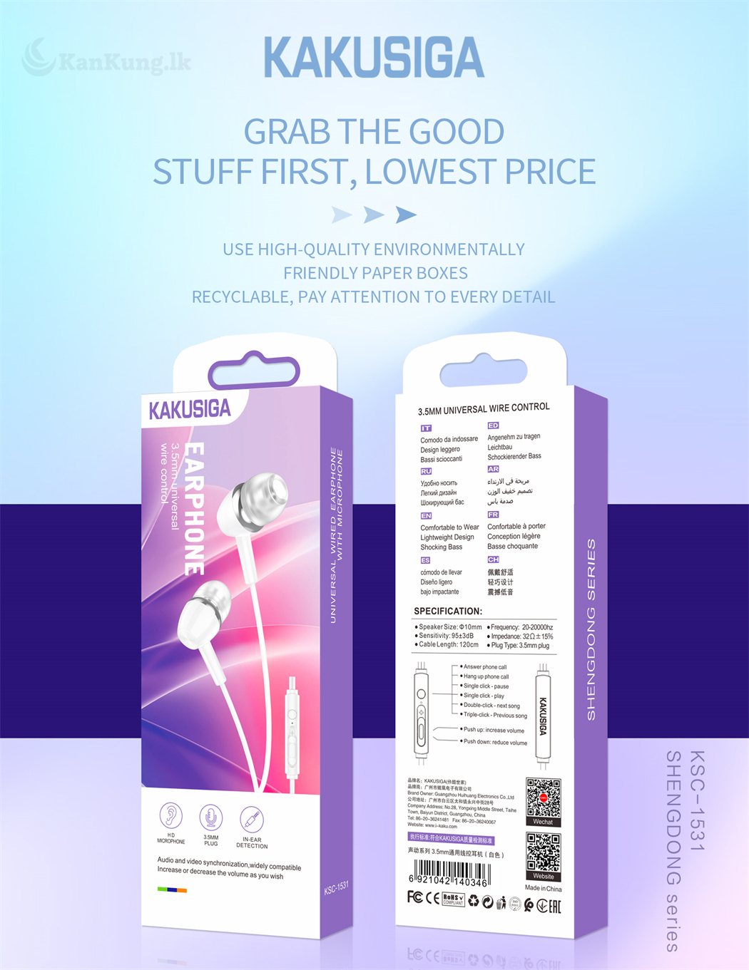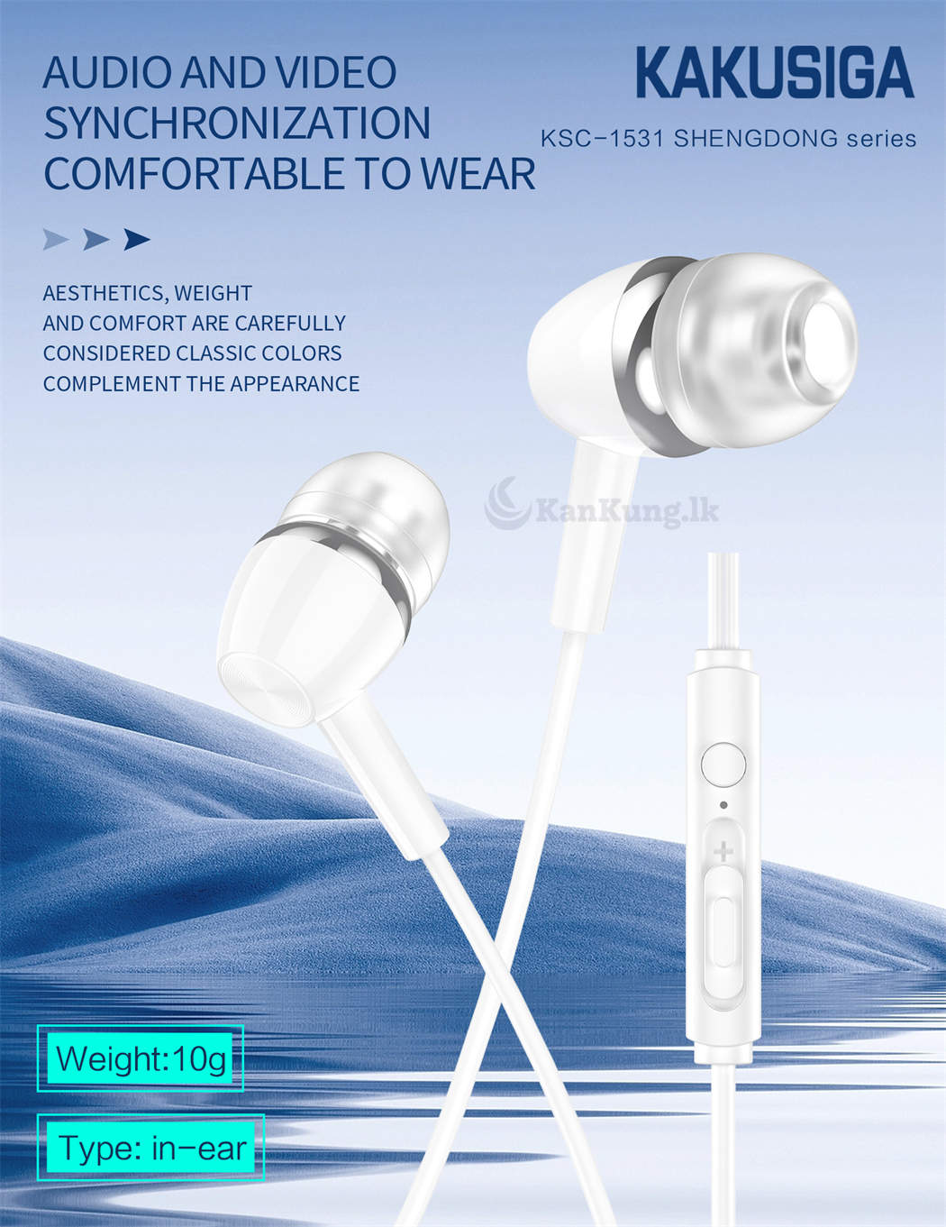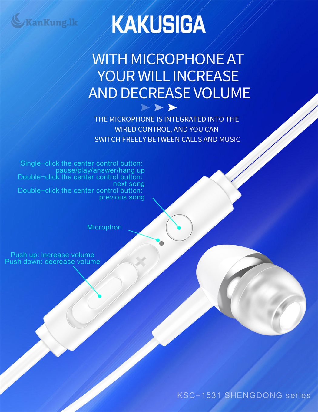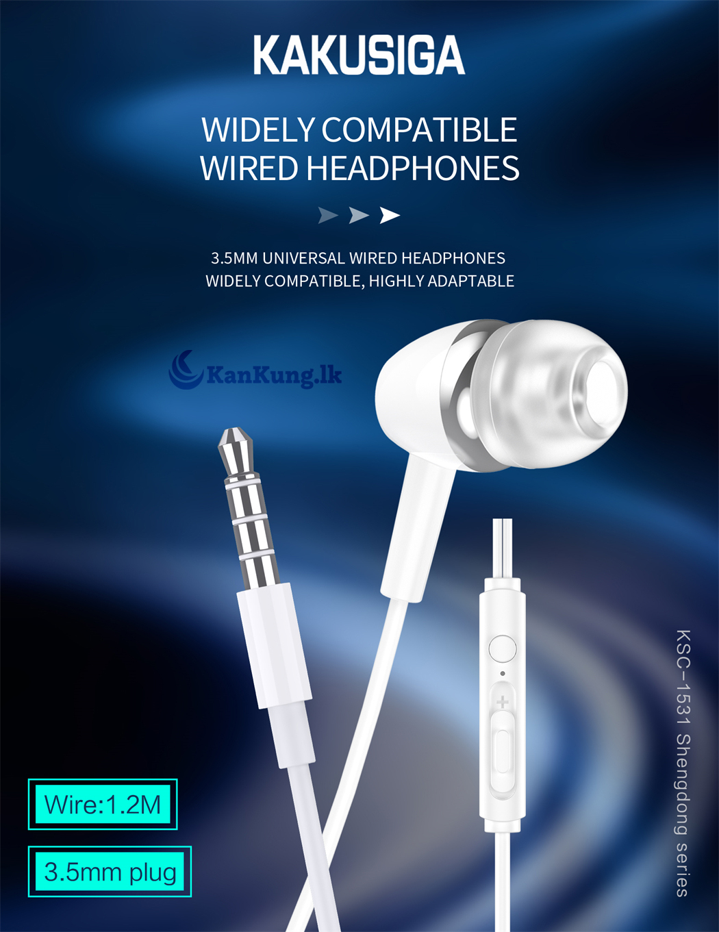 Grab the good stuff first at the lowest price! The KAKUSIGA KSC-1531 earphones are designed with comfort and quality in mind. Featuring a 3.5mm universal wire control, these earphones provide superior sound with a comfortable, lightweight design.