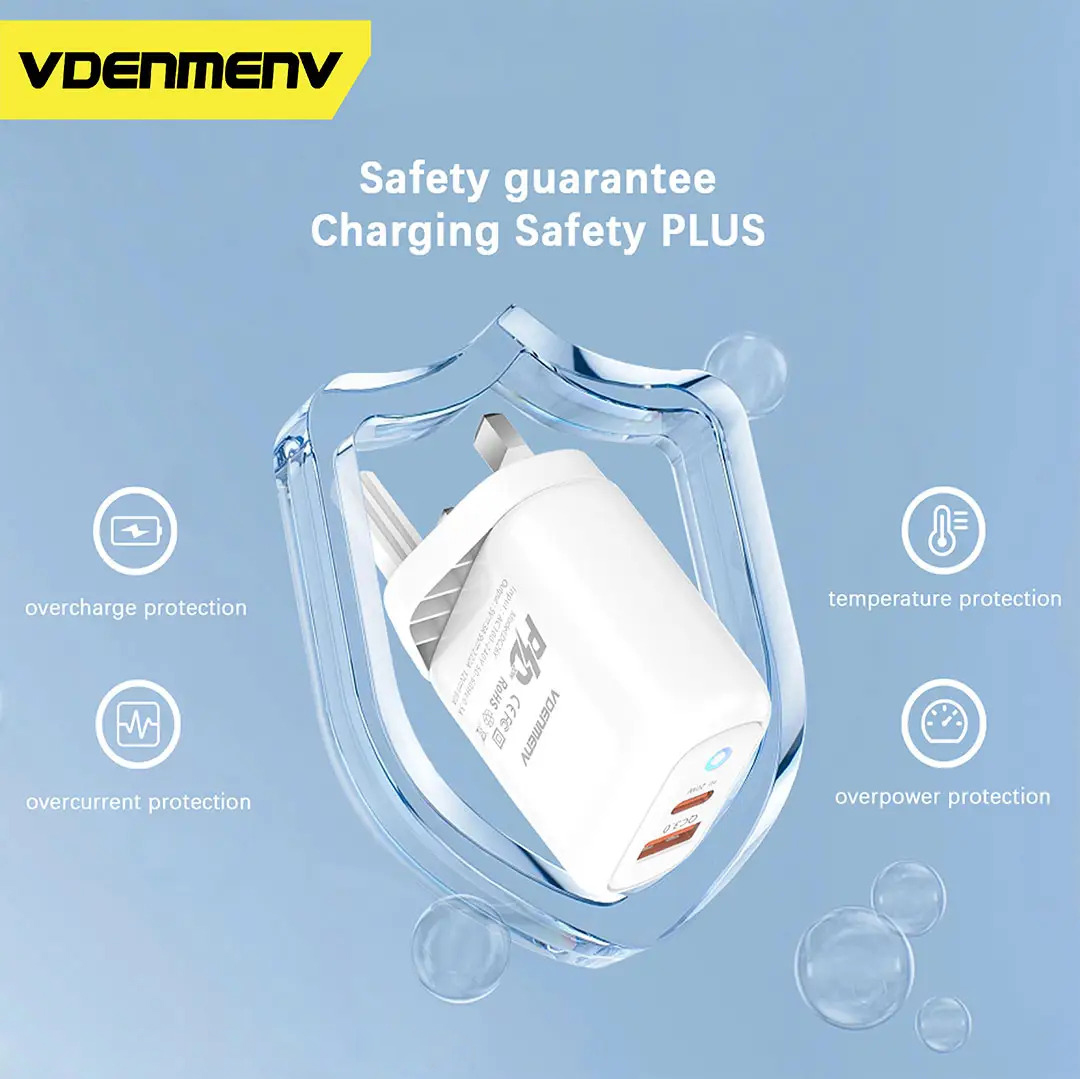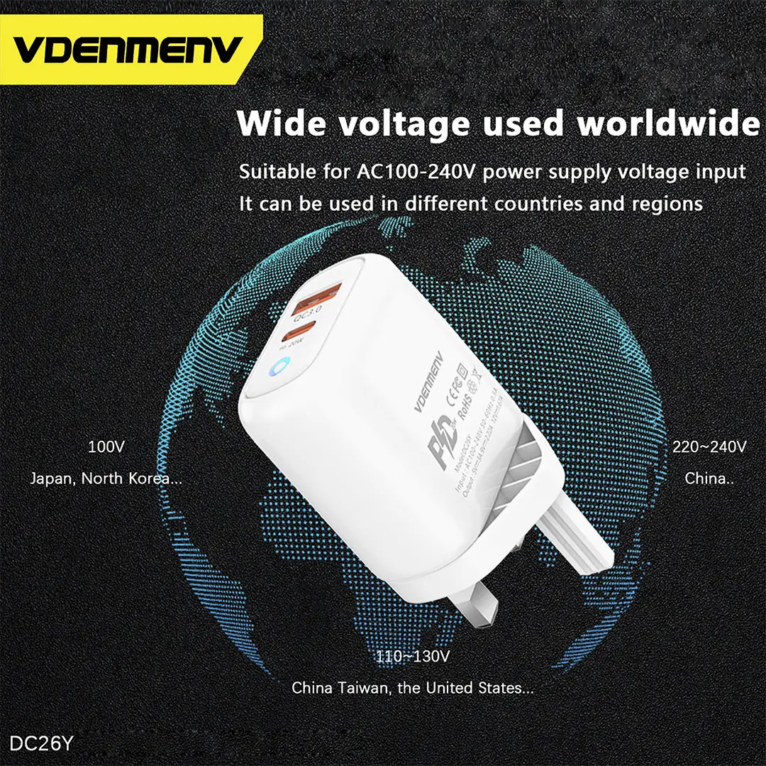 The VDENMENV DC26Y 20W Fast Charging Adapter is designed to provide rapid charging with Qualcomm Quick Charge 3.0 technology. This wall charger is compatible with various devices and ensures efficient and reliable power delivery. With built-in protection features, such as over-charge, over-heat, and fire-proofing, it guarantees the safety of your device while charging.